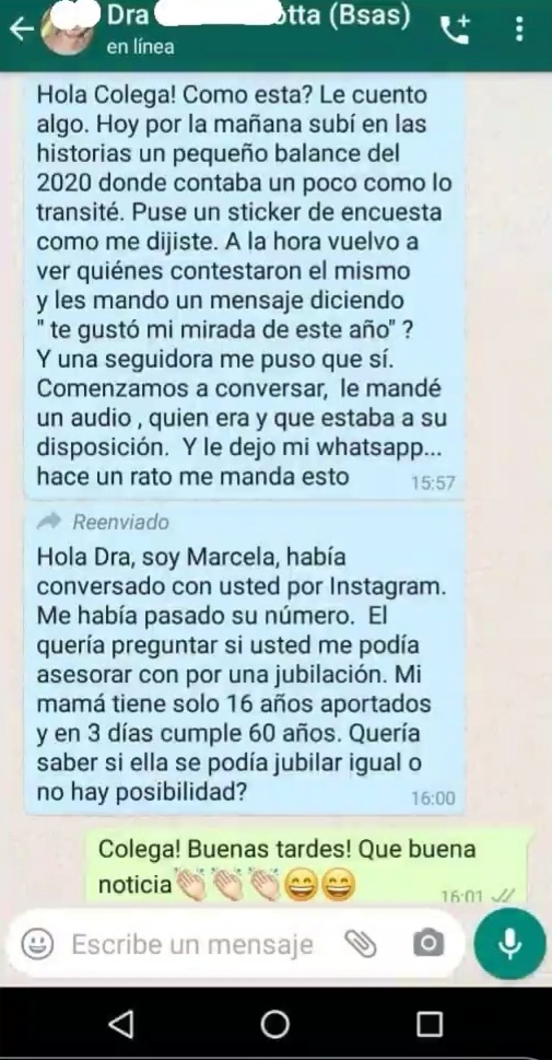 "Hola Colega! Como está? Le cuento algo. Hoy por la mañana subí en las historias un pequeño balance del 2020 donde contaba un poco como lo transité. Puse un sticker como me dijiste. A la hora vuelvo a ver quienes contestaron el mismo y les mando un mensaje diciendo 'Te gusto mi mirada de este año?. Y una seguidora me puso que sí, comenzamos a conversar, le mandé un audio, de quien era y que estaba a su disposición. Le dejo mi whatsapp.. hace un rato me mando esto.
