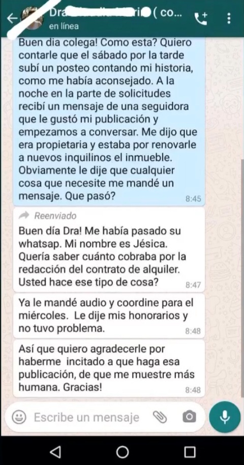"Buen dia colega, ¿como esta? Quiero contarle que el sabado por la tarde subí un posteo contando mi historia,como me había aconsejado. A la noche en la parte de solicitudes recibi un mensajede una seguidora que le gustó mi publicación y empezamos a conversar. Me dijo que era propietaria y estaba por renovarle a nuevos inquilinos el inmueble. Obviamente le dije que cualquier cosa que necesite me mande un mensaje. Que pasó?