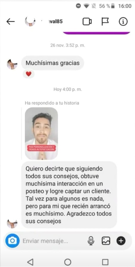 "Quería decirte que siguiendo todos sus consejos, obtuve muchisima interacción de un posteo y logré captar un cliente.."