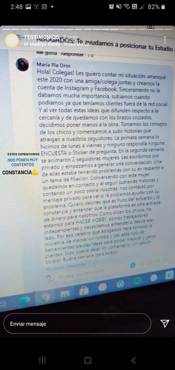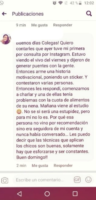 "Buenos dias colegas! Quiero contarles que ayer tuve mi primera consulta por instagram. Estuvo viendo el vivo del viernes y dijeron de generar puentes con la gente. Entonces arme una historia motivacional, poniendo un sticker. y contestaron varias personas. Entonces les respondi, comenzamos a charlar y..."